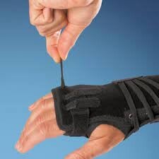 • The low profile ulnar splint that is made from a flexible spring material. It’s mounted in the open pocket on the ulnar side of the brace and can be adjusted individually to the patient to assist the zig-zag position of the wrist.