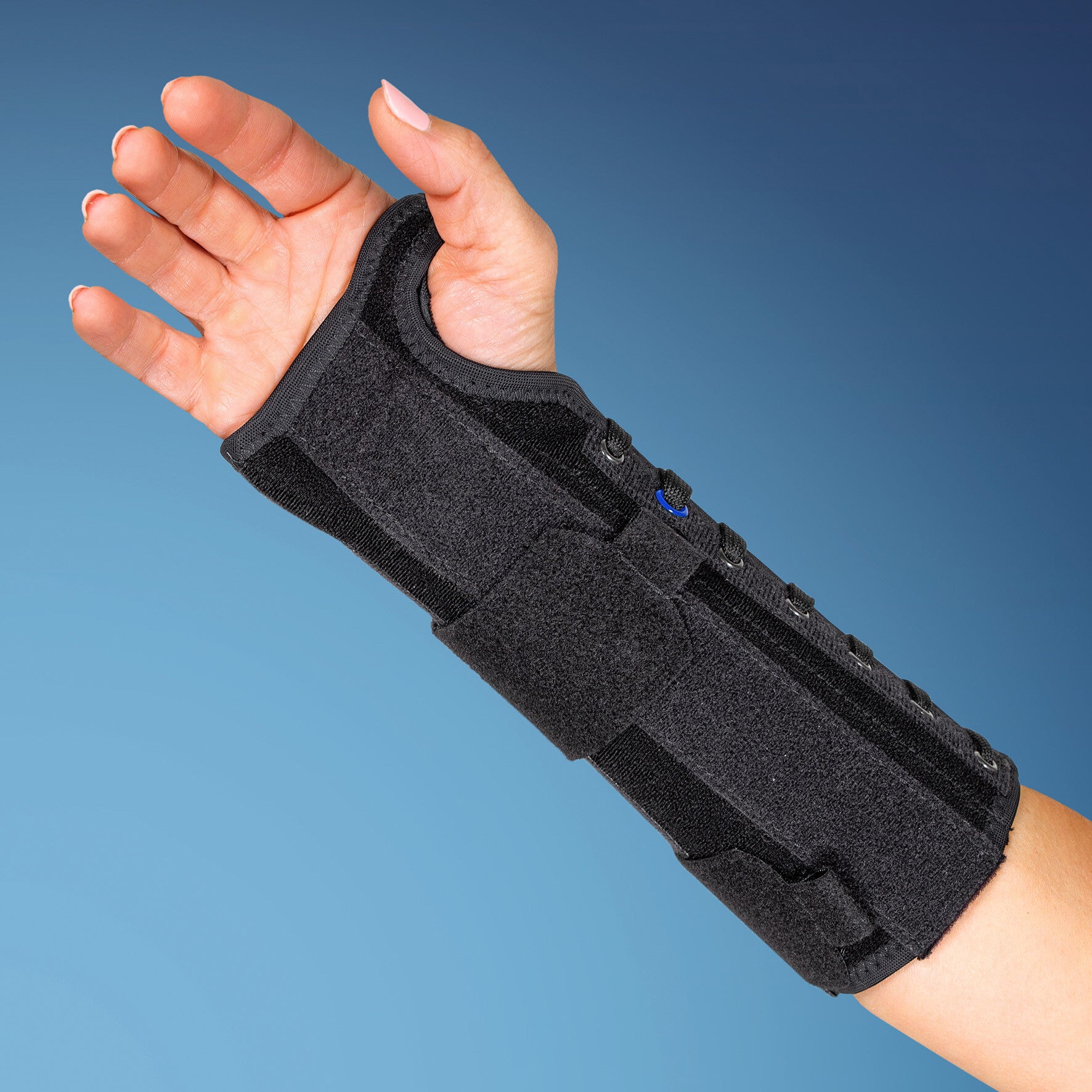 The DEX® wrists are available in three different lengths and a glove design with a Lycra tongue and a lace-up system for easy application. The lace-up system goes from radial side and attaches on the ulnar side of the brace. The hook tabs are made from micro hook that provides a low profile and secure attachment. The thumb strap has a Ventus tab that can be adjusted individually to expose more hook.