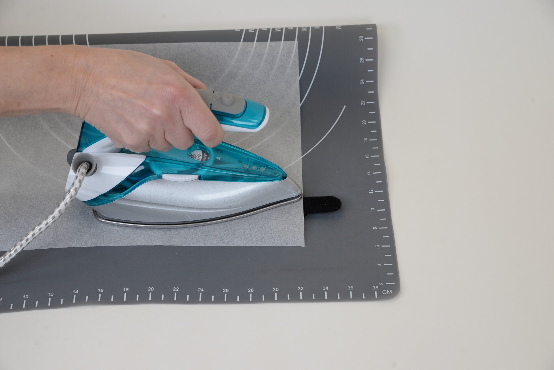 Cut the NRX® Loop Heat Tape in the desired length. We recommend that you cut it slightly longer than the surface as it might shrink during the heating. Cover the strap and material with another silicone baking sheet or Teflon paper. Use an iron or a heat press, set on 120–140 degrees Celsius. If you use an iron, disengage the steam function. Apply heat to the surface and wait for 10 seconds. Then check the result. If it has not bonded properly, simply extend the time.